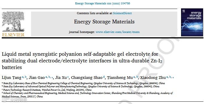 近日,来自青岛科技大学的高健副教授和朱晓东教授,在国际知名期刊Energy Storage Materials上发表题为“Liquid Metal Synergistic Polyanion Self-adaptable Gel Electrolyte for Stabilizing Dual Electrode/Electrolyte Interfaces in Ultra-Durable Zn-I2 Batteries”的研究文章。该研究报道了一种单分散的液态金属可以快速引发能够同步调控锌负极及碘正极聚阴离子凝胶电解质聚合。研究表明该电解质独特的化学组成及结构能够均匀锌负极电场及离子浓度场,抑制枝晶生长;还可以抑制游离水分子活性,抑制析氢、腐蚀等不良反应。与此同时,结合静电斥力和化学吸附还能够抑制多碘离子的穿梭,避免了多碘化物对锌负极的腐蚀及正极活性物的损失,为发展稳定、安全的水系锌碘电池提供了新的见解。
