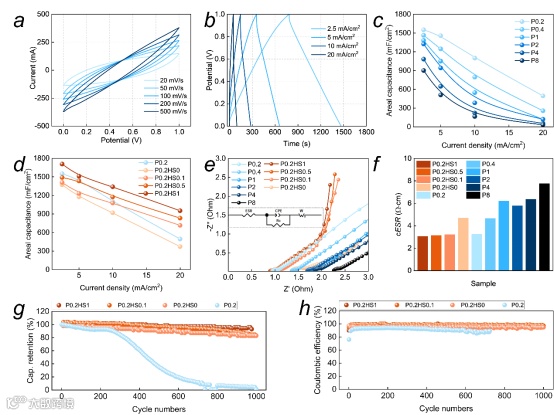 图2. CCS的电化学行为:(a, b) P0.2 HS1的CV和GCD曲线,(c, d) 面电容随成型压力和SDS添加量的变化曲线,(e, f) Nyquist图和等效串联电阻 (ESR),(g, h) 循环过程中的电容保持率和库仑效率