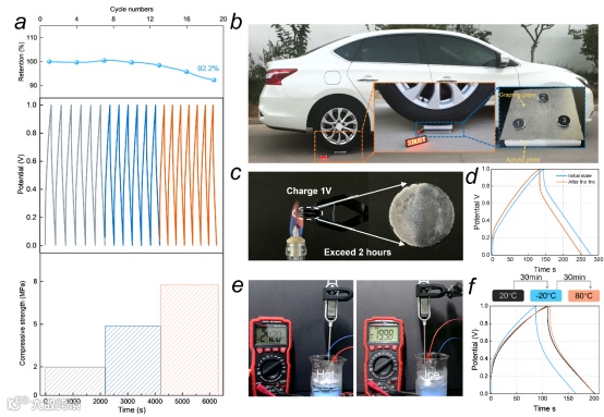 图4. CCS的多场景应用:(a) 加载条件下CCS的GCD曲线,(b) 3个平行连接的4.9 cm2器件在压缩载荷下照射发光二极管的照片。(c, d) 燃烧测试和燃烧测试后10 mA cm−2下的GCD曲线,(e, f) 在-20和80 °C下的应用,以及10 mA cm−2下的GCD曲线