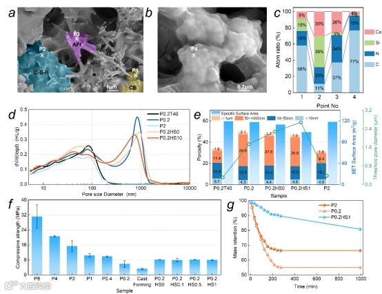 图3. CC电极的微观结构和物理特征:(a, b) 形貌,(c) 化学成分,(d) 孔径分布,(e) 孔隙率和比表面积,(f)抗压强度,(g) 未封装状态下60℃烘箱中的质量变化