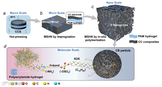 图1. CC电极的多尺度设计,涉及 (a) 热压制备,通过 (b) 水凝胶浸渍和 (c) 原位聚合构建从微米级到纳米级的MSHN。(d) 在分子尺度上,SDS作为促进PAM单体在CB表面原位聚合的桥梁
