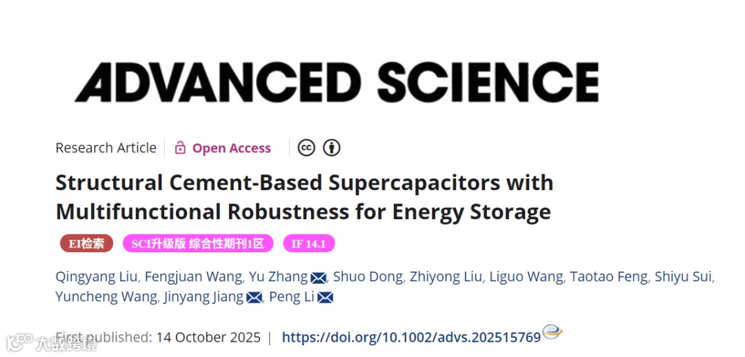 近日,来自山东科技大学的张宇教授、李朋教授与东南大学的蒋金洋教授合作,在国际知名期刊Advanced Science上发表题为“Structural Cement-Based Supercapacitors with Multifunctional Robustness for Energy Storage”的文章。该研究提出了一种凝胶电解质与多孔水泥基电极的界面优化设计方法,并构建了物理强度与电化学性能协同共优的结构超级电容器设计策略。
