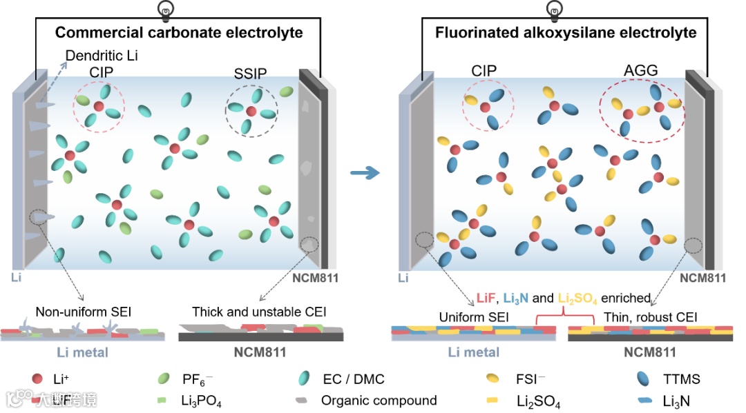 随着长续航电动汽车/船舶、便携式电子设备和无人机等新兴应用的快速发展,市场对高能量密度电池的需求日益增长。目前,锂离子电池受限于金属氧化物正极和石墨负极的较低容量,能量密度通常仅为150-250 Wh/kg。为提升能量密度,开发高容量且具有大电位差的电极材料至关重要:正极方面,LiNi0.8Co0.1Mn0.1O2(NCM811)因理论容量高(约 280 mAh・g⁻¹)、工作电压高(>3.7 V)具备竞争力,但在4.3 V截止电压下实际容量仅190-200 mAh・g⁻¹,需将截止电压提升至4.7-4.8 V以实现高比能;负极方面,锂(Li)金属因容量极高(3860 mAh・g⁻¹)、电位极低(相对于标准氢电极为- 3.04 V)成为理想选择,因此高电压(≥4.7 V)Li||NCM811体系被视为实现350-500 Wh・kg⁻¹ 高能量密度电池的有效方案之一。然而,现有电解液难以同时适配高氧化性的NCM811正极与高还原性的Li金属负极:碳酸酯电解液虽在高电位下抗氧化稳定性较好,却易与Li金属形成劣质固体电解质界面(SEI),导致电解液持续分解、锂枝晶生长及电池失效;醚类电解液虽与Li金属兼容性优异,但氧化稳定性差(<4.0 V vs Li/Li⁺),无法满足高电压需求。此前虽有高浓度电解液(HCEs)、局部高浓度电解液(LHCEs)等策略尝试提升醚类电解液的高电压稳定性,但HCEs存在成本高、黏度大等问题,LHCEs中的游离醚溶剂仍易在≥4.7 V下氧化分解,难以突破“4.7 V瓶颈”,因此开发能适配高电压Li||NCM811体系的新型电解液成为关键。
