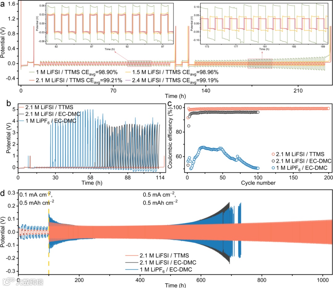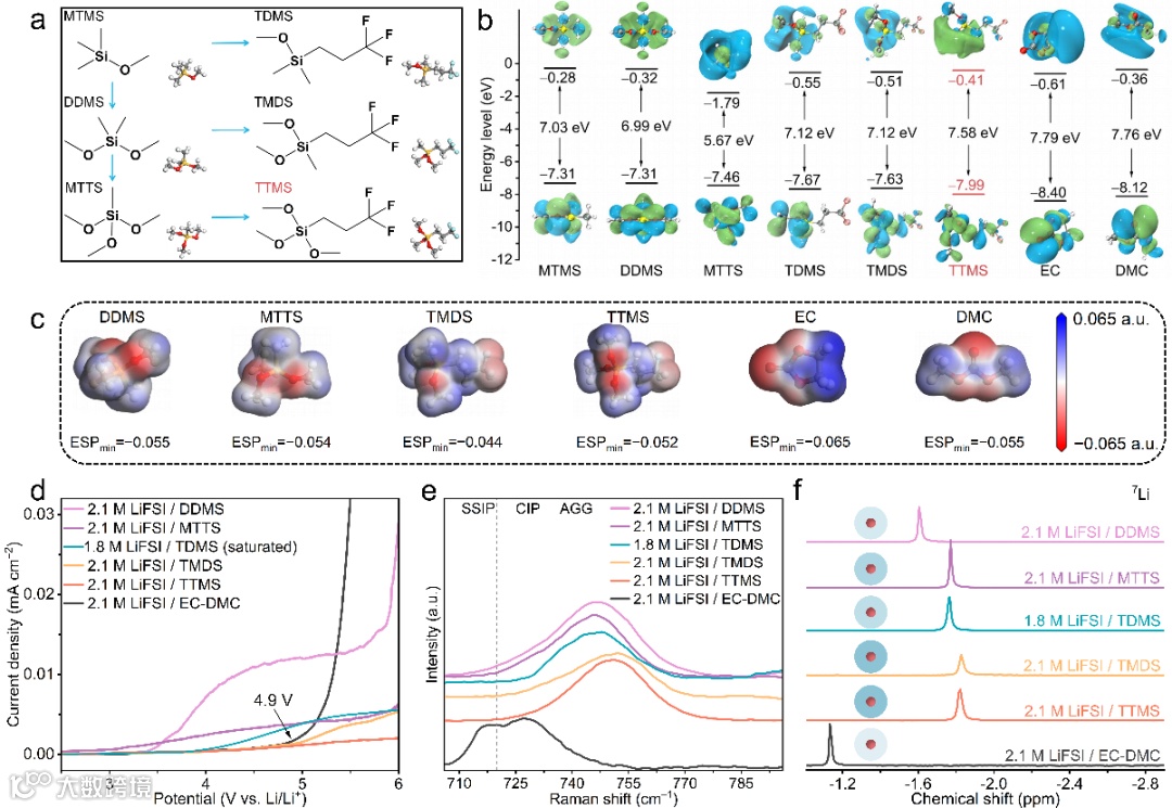 提出以(3,3,3-三氟丙基)三甲氧基硅烷(TTMS)作为高电压锂金属电池的单溶剂,其分子结构兼具强溶剂化(-OCH₃)与弱溶剂化(-CF₃)基团:-CF₃中的C-F键(键能527 kJ・mol⁻¹)赋予溶剂本征抗氧化性,使电解液电化学窗口宽达6 V,远超传统醚类电解液(<4.0 V vs Li/Li⁺);-OCH₃基团则助力LiFSI 盐溶解,最终形成2.1 mol・L⁻¹(M)的LiFSI/TTMS 电解液。该溶剂设计突破了传统醚类电解液的“4.7 V 瓶颈”,同时规避了高浓度电解液(HCEs)成本高、黏度大及局部高浓度电解液(LHCEs)游离溶剂易分解的问题,为高电压适配性电解液开发提供了新分子范式。