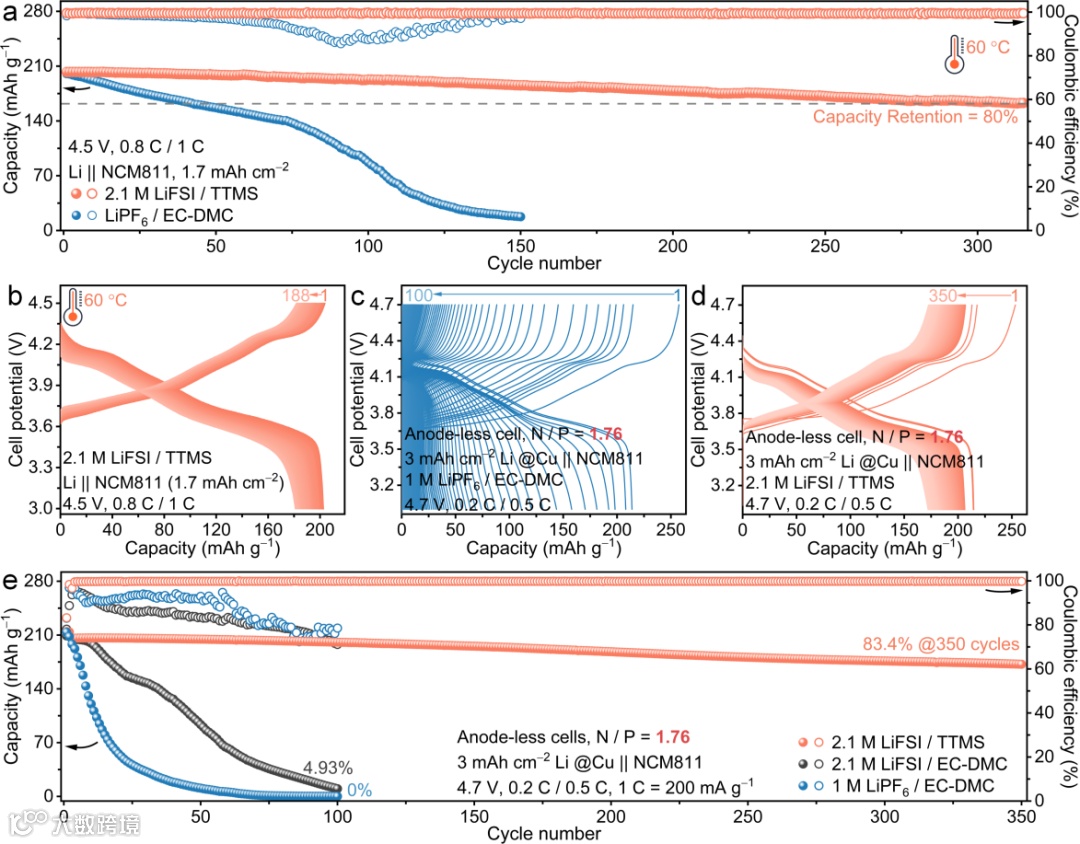 该电解液在多种严苛条件下展现出优异性能:在4.8 V超高电压下,Li||NCM811电池循环300次容量保持率达84.5%;60℃高温环境中,电池循环300次容量保持率仍超80%,平均库伦效率99.47%;无负极(N/P比=1.76)结构下,循环350次容量保持率约 83.4%。此外,其倍率性能突出,0.1 C至3 C下放电容量为157-214 mAh・g⁻¹,且成功适配1 Ah石墨||NCM811软包电池,无需脱气或二次密封即可循环600次,容量保持率80%、平均库伦效率99.81%,验证了该电解液在实际电池体系中的应用潜力。