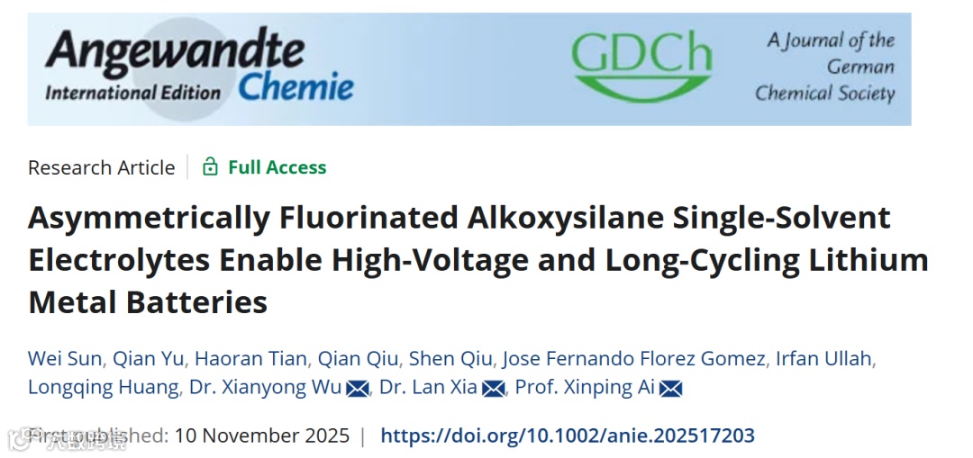 Wei Sun+, Qian Yu+, Haoran Tian, Qian Qiu, Shen Qiu, Jose Fernando Florez Gomez, Irfan Ullah, Longqing Huang, Xianyong Wu*, Lan Xia*, Xinping Ai*, Asymmetrically Fluorinated Alkoxysilane Single-Solvent Electrolytes Enable High-Voltage and Long-Cycling Lithium Metal Batteries, Angewandte Chemie International Edition, 2025, e17203.