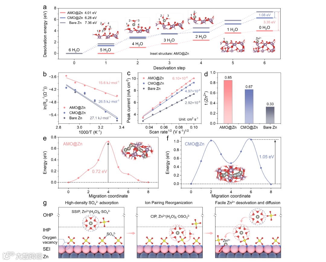 图4. Zn2+脱溶剂化与扩散行为研究。(a) 不同负极界面处水合Zn2+的逐步脱溶剂化能(详细DFT模型见图S22-S24)。注:不同界面处Zn2+的溶剂化结构与分子动力学模拟结果一致。(b) 基于阿伦尼乌斯曲线的脱溶剂化活化能。(c) 通过Randles-Sercik曲线获得的Zn2+扩散系数。(d) 基于计时电流法极化曲线与电化学阻抗谱测试的不同界面Zn2+迁移数。(e) AMO@Zn与(f) CMO@Zn界面SEI中Zn2+扩散能垒计算。(g) 富氧空位SEI界面通过离子对重组促进Zn2+脱溶剂化的机理示意图。