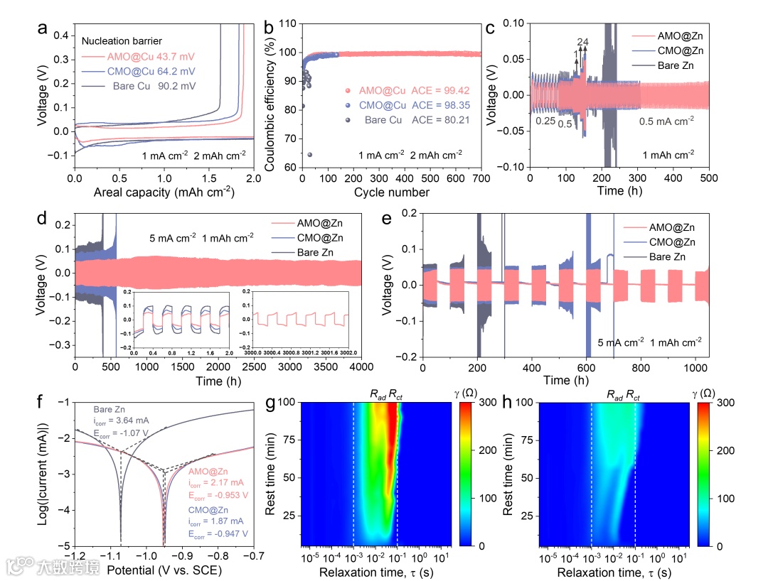 图2. AMO@Zn与CMO@Zn负极的电化学性能。(a) 裸铜、CMO@Cu及AMO@Cu非对称电池在1 mA cm-2电流密度下的首圈电压曲线。(b) 1 mA cm-2与2 mAh cm-2条件下的锌沉积/剥离库仑效率。(c) 对称电池的倍率性能、(d) 循环性能及(e) 静置恢复性能。(f) 塔菲尔曲线及对应的腐蚀电流与腐蚀电位。(g) 裸锌与(h) AMO@Zn对称电池在静置期间通过原位电化学阻抗谱进行的弛豫时间分布分析。