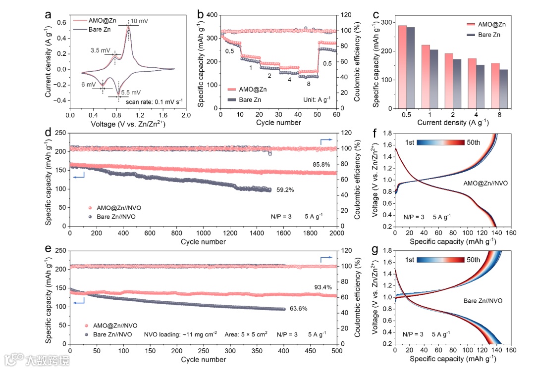 图5. 采用AMO@Zn负极的水系锌金属电池电化学性能。(a) 0.1 mV s-1扫描速率下的循环伏安曲线。(b) 倍率性能及(c) 0.5-8 A g-1电流密度区间对应的平均容量。(d) 纽扣电池在5 A g-1电流密度下的循环性能。(e) 软包电池在5 A g-1电流密度下的循环性能及(f,g) 对应50圈循环的充放电曲线。