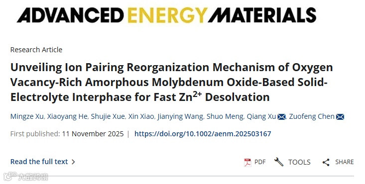 揭示富氧空位非晶氧化钼基固态电解质界面离子配对重组机制助力Zn2+快速去溶剂化