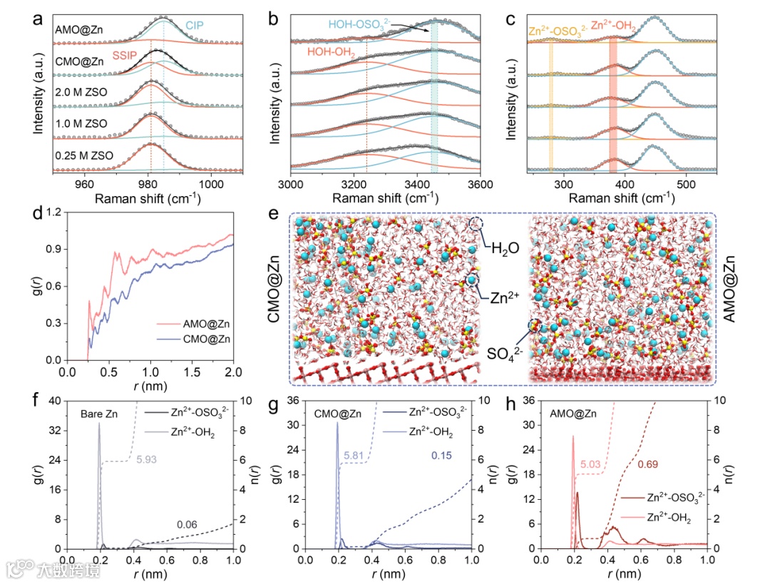 图3. 离子对重组机制。(a) ν-SO42-波段、(b) O-H伸缩振动与(c) Zn-O伸缩振动的拉曼光谱。(d) CMO@Zn与AMO@Zn在SEI界面处SO42-的径向分布函数。(e) CMO@Zn(左)与AMO@Zn(右)在298 K的2 M ZnSO4水溶液中的分子动力学模拟快照。(f) 裸锌、(g) CMO@Zn及(h) AMO@Zn表面的Zn2+-OSO32-与Zn2+-OH2配对径向分布函数。
