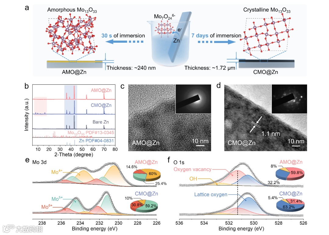 图1. AMO@Zn与CMO@Zn负极的制备与表征。(a) AMO@Zn与CMO@Zn的制备流程。(b) 纯锌、AMO@Zn及CMO@Zn的X射线衍射图谱。(c) AMO@Zn与(d) CMO@Zn的透射电子显微镜图像。(e) Mo 3d与(f) O 1s X射线光电子能谱谱图(AMO@Zn与CMO@Zn)。