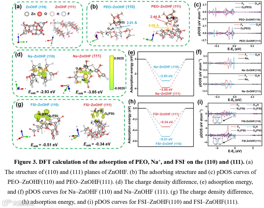 DFT计算结果表明,在ZnOHF的(110)晶面上,每个钠离子可与四个−OH基团相互作用,而在(111)晶面上则与三个−OH和一个F⁻相互作用。此外,(110)晶面具有更低的钠离子吸附能(-2.93 eV),这使其更易于捕获和解离钠离子,从而提升离子电导率和钠离子迁移数。同时,(110)晶面对FSI⁻阴离子的吸附能(-0.51 eV)强于(111)晶面(-0.34 eV),有助于抑制阴离子迁移并优化电场均匀分布。