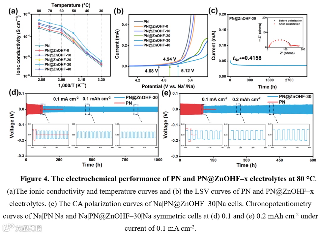 通过对Zn(OH)F-30填料中−OH 和 F⁻ 基于 Lewis 酸碱理论进行精确控制,所制备 PN@ Zn(OH)F−30电解质实现了多重目标协同改善,工作温度下其导电率为5.74×10⁻⁴ S cm-1,电化学稳定窗口达至5.12 V,Na|PN@ Zn(OH)F−30|Na对称池能以仅15 mV过电势持续运转1000 h。