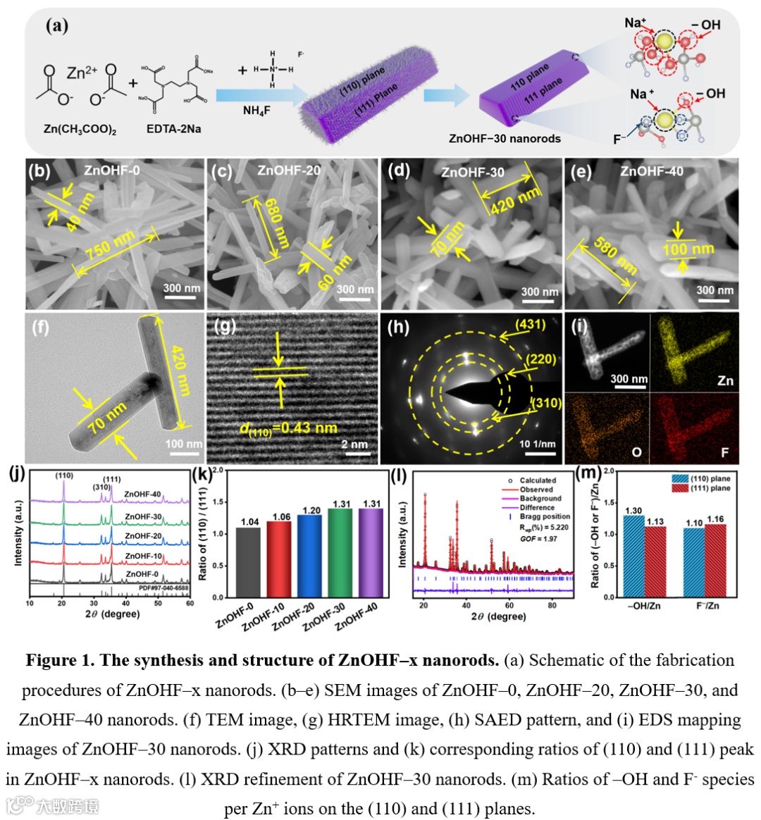 在PEO基体中加入无机填料是解决聚合物电解质局限性的一种有效策略。无机填料含有大量吸引阴离子的路易斯酸基团,能够提高钠盐的溶解度并降低聚合物的结晶度。研究表明,使用乙二胺四乙酸(EDTA)可有效调节ZnOHF填料的(110)和(111)晶面。EDTA通过与锌离子配位,实现了对纳米棒形态的精确控制,并调节了−OH和F−的路易斯酸强度。ZnOHF纳米棒的(110)面能够暴露更多的−OH基团。