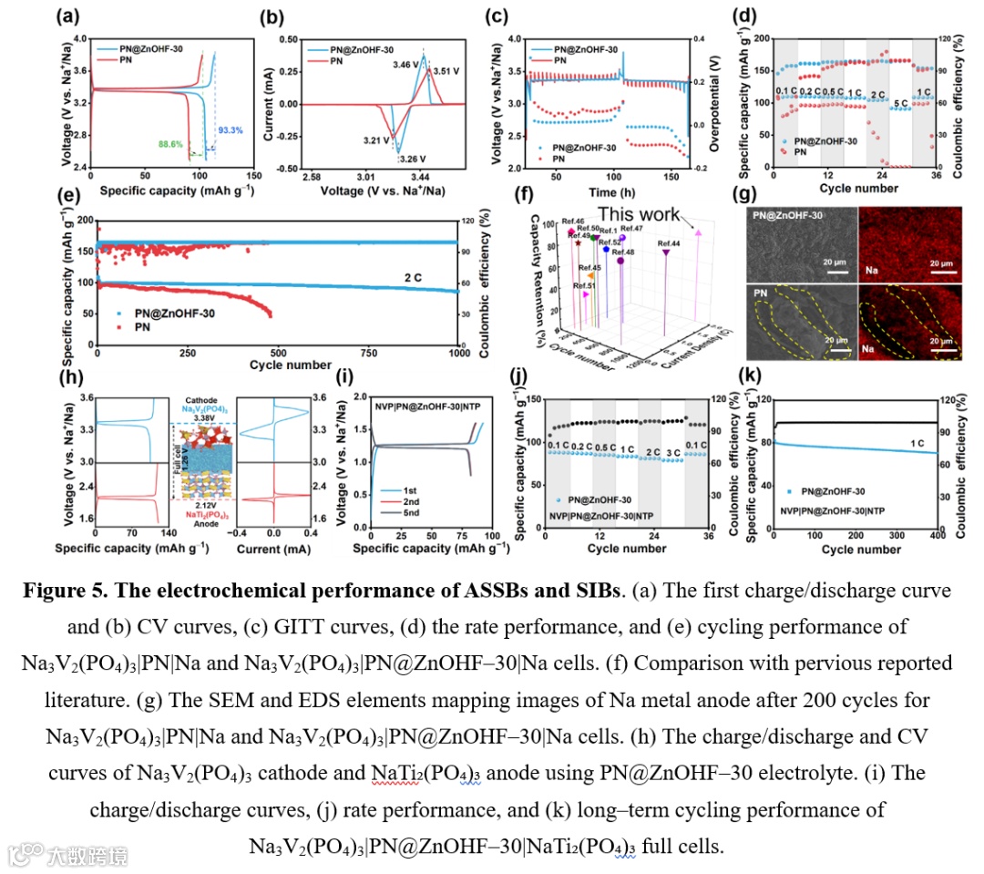 在PEO基聚合物固态电解质中引入ZnOHF−30填料所制备的PN@ZnOHF−30电解质,显著改善了机械性能和电化学性能。采用该电解质的Na₃V₂(PO₄)₃|PN@ZnOHF−30|Na半电池在工作温度下实现了1000次循环,容量保持率达86.6%。在5C倍率下展现出92.1 mAh g⁻¹的比容量。循环200圈后,SEM观察显示钠金属表面保持光滑,这种均匀的钠沉积有效抑制了枝晶形成,从而提升了电池的电化学性能。此外,Na₃V₂(PO₄)₃|PN@ZnOHF−30|NaTi₂(PO₄)₃全电池表现出优异的循环稳定性(400次循环后容量保持率88.1%)。研究证实,通过优化ZnOHF(110)和(111)晶面−OH和F⁻基团的界面调控策略所开发的PN@ZnOHF−30电解质,显著提高了钠离子电池(SIB)和固态金属电池(SSMB)的安全性与电化学性能,展现了其在未来高安全性储能系统中的应用潜力。