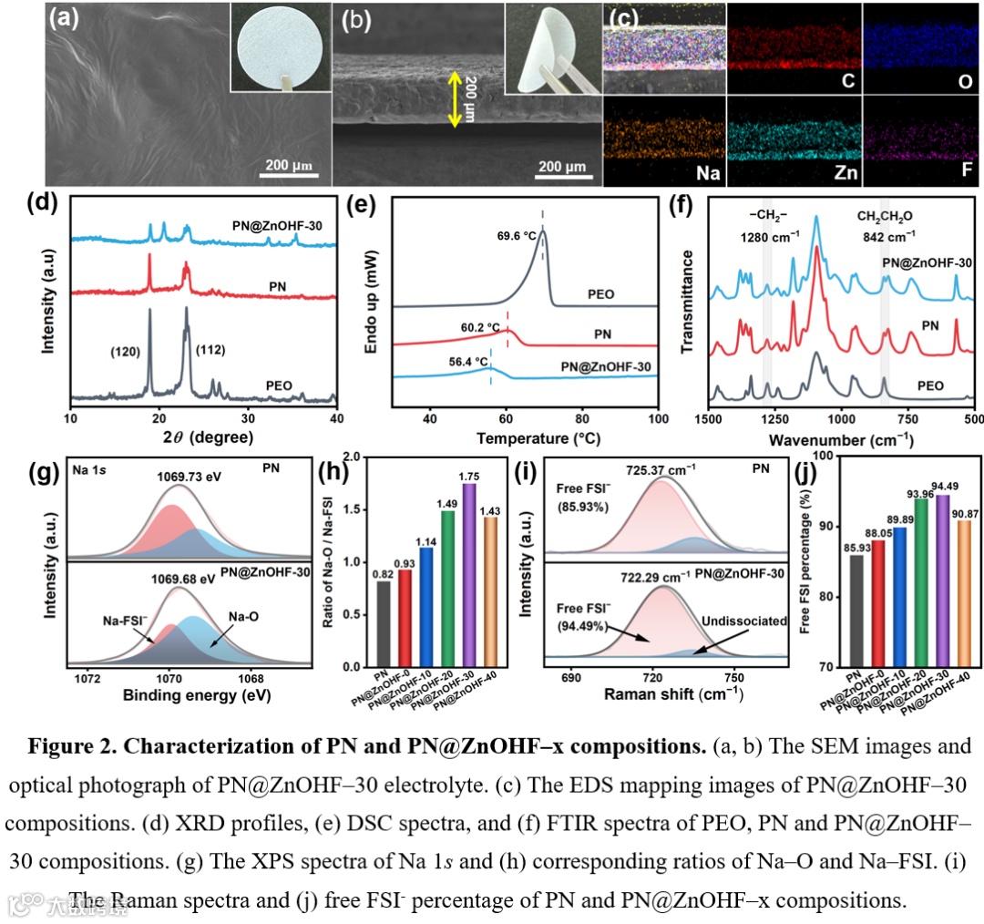 针对钠离子迁移缓慢以及与钠金属负极界面稳定性不足的问题,本研究利用ZnOHF的(110)晶面暴露较多−OH基团的特性,优化了聚合物-无机界面处的Lewis酸相互作用。通过FTIR光谱、XPS和Raman测试表明,ZnOHF−30纳米棒中(110)晶面的−OH基团有效促进了钠盐的解离,并降低了PEO基质的结晶度。这进一步促进了游离钠阳离子与醚氧基团之间更高效的配位,减少了阴离子迁移,并实现了电场的均匀分布。