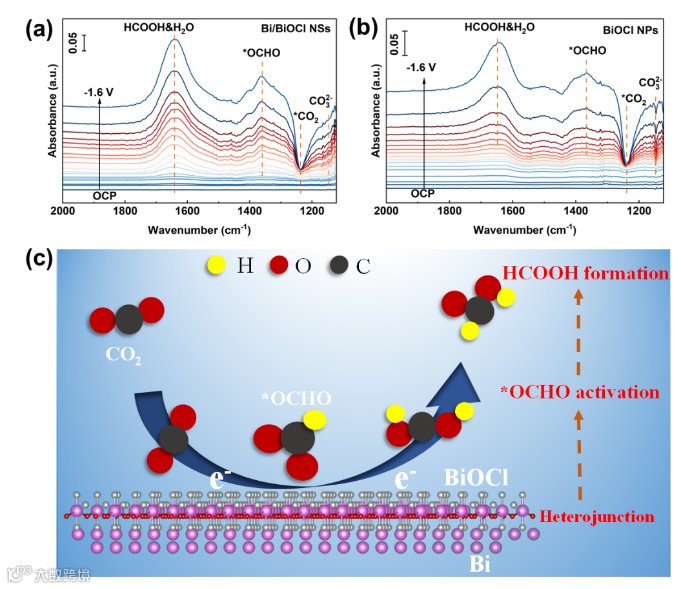 进一步进行了原位衰减全反射傅里叶变换红外光谱(ATR-FTIR)测量,通过比较Bi/BiOCl-NS和BiOCl-NP催化剂上的信号强度和eCO2RR的中间类型来推断反应途径。根据原位电化学ATR-FTIR测量的结果,可以合理地得出结论,在Bi/BiOCl-NS中引入异质结可以激活CO2还原形成中间体*OCHO,然后促进HCOOH的形成(图6c)。
