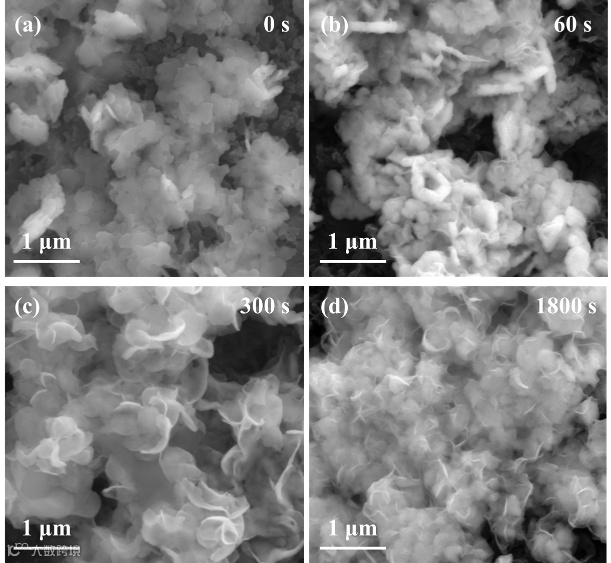图2. Bi/BiOCl NSs电极在100 mA cm−2下,负载为0.5 mg cm−2,a) 0 s, b) 60 s, c) 300 s, d) 1800 s的非原位SEM图像。