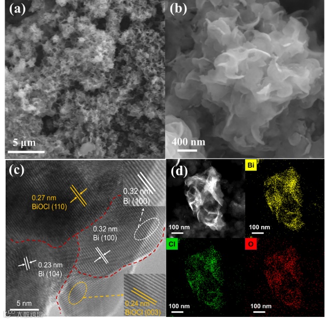 图1. Bi/BiOCl 纳米片的表征。(a)和(b)为SEM图像。(c)HRTEM图像。(d)HAADF-STEM图像以及相应的 EDS 元素分布图像,其中 Bi(黄色)、Cl(绿色)和 O(红色)。