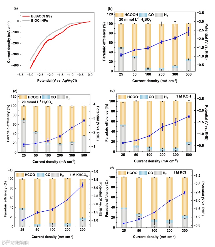 图4. a) Bi/BiOCl NSs和BiOCl-NPs的LSV曲线。b)20 mmol∙L-1 H2SO4(溶解于1 mol·L-1 KCl)中 Bi/BiOCl NSs 的 eCO2RR 产物分布和电压。c)20 mmol∙L-1 H2SO4(溶解于1 mol·L-1 KCl)中BiOCl-NPs 的 eCO2RR 产物分布和电压。d)1 M KOH、e)1 M KHCO3和f)1 M KCl中 Bi/BiOCl NSs 的 eCO2RR 产物分布和电压。