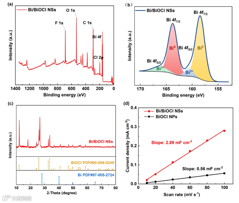 图3. a) Bi/BiOCl NSs的XPS光谱,b) Bi 4f的高分辨率XPS光谱。c) Bi/BiOCl NSs的XRD谱图。d) Bi/BiOCl-NS和BiOCl-NP的充电电流密度差异与扫描速率的关系。