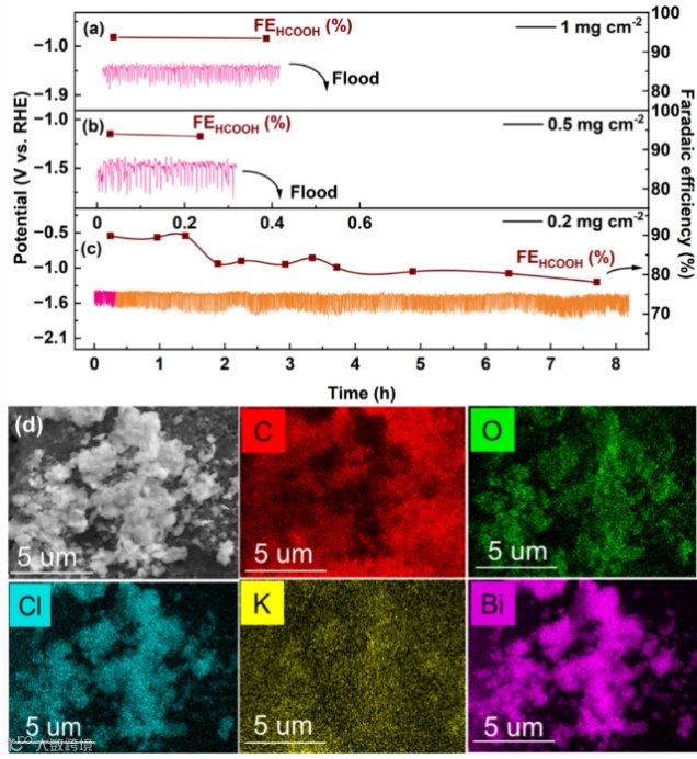 图5. 100 mA cm-2的电流密度下,a)在不同负载为1.0 mg cm-2,b)0.5 mg cm-2和c)0.2 mg cm-2 下Bi/BiOCl NSs稳定性测试中的FE和电位变化。d)负载0.2 mg cm-2的Bi/BiOCl NSs稳定性测试后的SEM图像和相应的EDS元素映射图像。