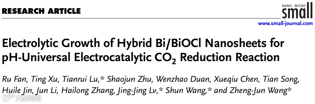 近日,温州大学王舜、吕晶晶,王正军课题组,在国际知名期刊Small上发表题为“Electrolytic growth of hybrid Bi/BiOCl nanosheets for pH-universal electrocatalytic CO2 reduction reaction”的研究文章。文章采用电解生长工艺设计了一种具有均匀分散的杂化金属铋和次氯酸铋纳米片(Bi/BiOCl NSs)的自支撑电极,得到的Bi/BiOCl NSs具有丰富的活性异质结位点,在全pH范围内可将CO2高效转化为甲酸和甲酸盐,最大法拉第效率均超过90%。