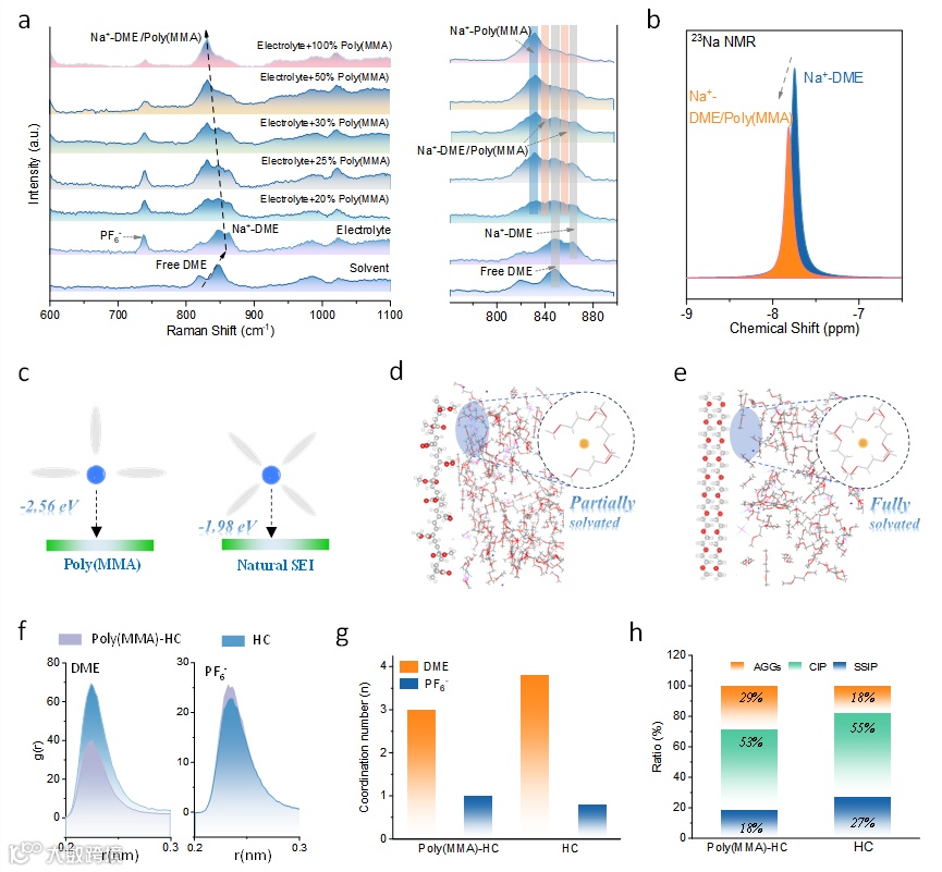 通过多尺度表征与理论计算相结合,系统阐明了Poly(MMA)界面层调控钠离子溶剂化结构的分子机制。拉曼光谱分析表明,随着Poly(MMA)含量的增加,Na⁺–DME配位特征信号逐渐减弱,同时Na⁺–DME/Poly(MMA)复合配位峰发生红移,且Na⁺–Poly(MMA)特征峰显著增强,证实钠离子的第一溶剂化壳层由单一DME配位模式转变为Na⁺–DME/Poly(MMA)协同配位构型。²³Na核磁共振谱中化学位移的变化进一步验证了溶剂化强度的整体减弱。理论计算结果显示,Na⁺在Poly(MMA)界面上的吸附能显著高于其在天然SEI上的吸附能,表明Poly(MMA)对钠离子具有更强的界面锚定作用。分子动力学模拟直观呈现了钠离子在界面区域由完全溶剂化状态向部分脱溶剂化状态转变的动态过程。径向分布函数与配位数分析定量揭示了Na⁺–DME配位强度明显降低,而Na⁺–PF₆⁻相互作用保持稳定且略有增强。离子对分布统计进一步显示,AGG比例显著上升,CIP/SSIP比例下降,表明界面处钠离子周围的溶剂分子数量减少,离子-阴离子关联作用增强。基于上述多维度证据,本研究提出Poly(MMA)通过构建"Na⁺–DME/Poly(MMA)"混合配位界面,现了"部分脱溶剂化",有效降低了脱溶剂化能垒。