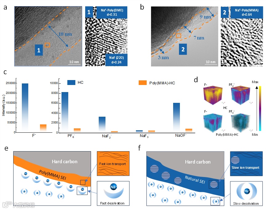 对界面化学组成与微观结构的深入解析进一步揭示了Poly(MMA)修饰层的独特优势。首周嵌钠过程后,未改性硬碳表面形成了厚度约18 nm的非均质SEI,其中可见晶面间距为0.24 nm的NaF微晶(对应(220)晶面);而经Poly(MMA)修饰的硬碳表面则未观察到明显无机相析出,其聚合物界面层由初始5 nm轻微溶胀至约7 nm,层间距由0.51 nm扩展至0.64 nm,表明该界面在循环过程中仅发生轻度溶胀,且几乎不伴随电解液分解产物的生成与积累。