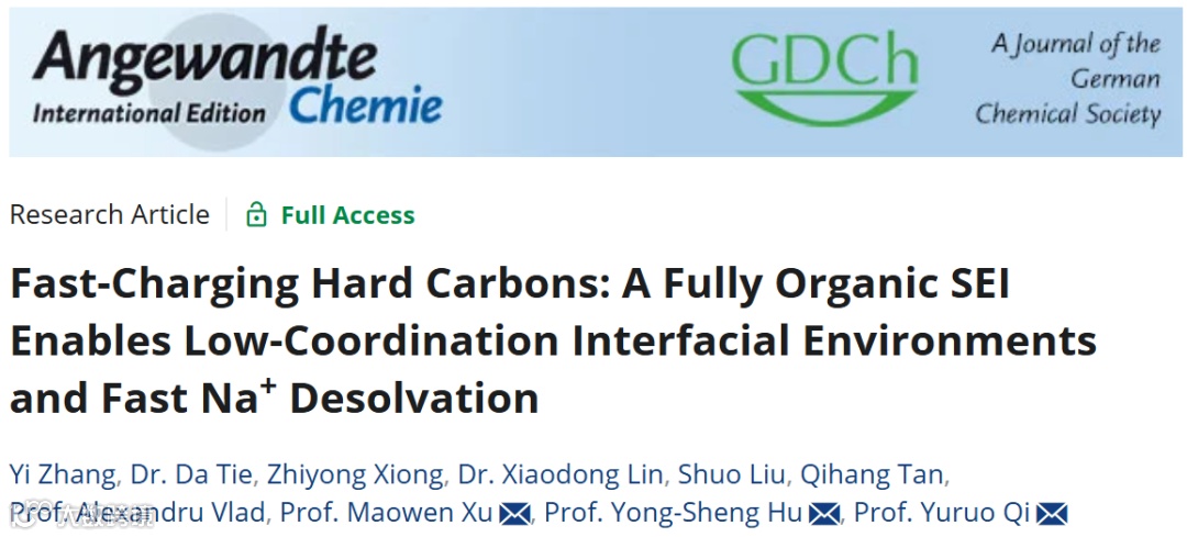 相关成果以“Fast-Charging Hard Carbons: A Fully Organic SEI Enables Low-Coordination Interfacial Environments and Fast Na+ Desolvation”为题发表在Angewandte Chemie International Edition上。