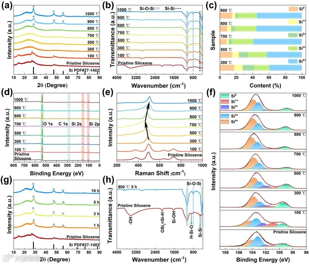 图2. 不同温度和保温时间下硅氧烯的演变。(a)不同退火温度下的XRD图谱,(b) FTIR光谱,(e)拉曼光谱。(d) XPS全光谱,(c)子峰相对含量,(f) Si 2p。(g) 900℃下不同保温时间下硅氧烷的XRD图谱。(h)原始硅氧烷和Si/SiO2的FTIR光谱