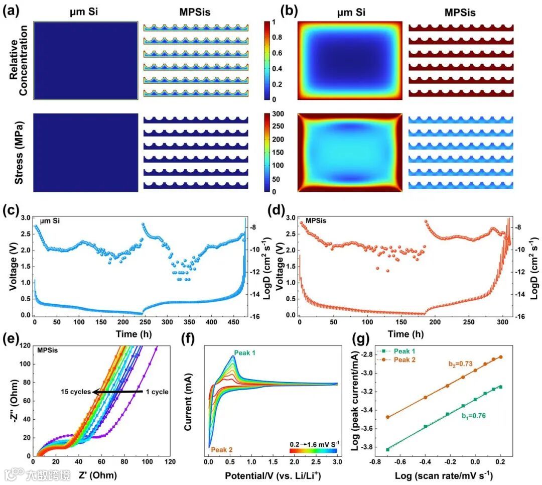 图5. 有限元分析和动力学分析。模拟MPSis和μmSi在(a) 0%和(b) 100%锂化状态下的锂浓度和应力分布。(c, d) MPSis和μmSi的GITT和扩散系数。(e)EIS和(f)不同扫描速率下的CV曲线。(g)扫描速率与峰值电流的关系