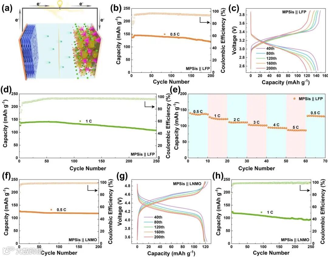 图7. 采用(a−e) LFP和(f−h) LNMO正极的全电池的电化学表征。(a) MPSis||LFP电池的行为示意图。MPSis||LFP电池在0.5 C下的循环性能(b)和恒流充放电曲线(c)。(d) MPSis||LFP电池在1 C下的循环性能和(e)倍率性能。MPSis||LNMO电池(f)0.5 C下的的循环性能 (g)恒流充放电曲线和(h)1 C下的循环性能