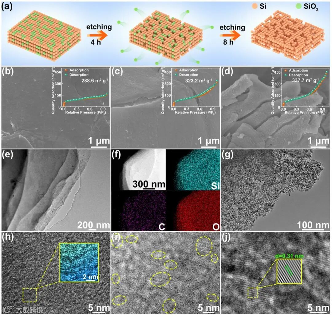 图3. (a) Si/SiO2的结构演变示意图。(b-d)不同蚀刻时间:(b)原始、(c) 4 h和(d) 8 h下得到的产物的SEM图像和N2吸附-解吸等温线。(e) Si/SiO2的TEM和 (f) STEM-EDS图谱。(g) MPSis的透射电镜。(h)硅氧烷,(i) Si/SiO2和 (j) MPSis的HRTEM图像