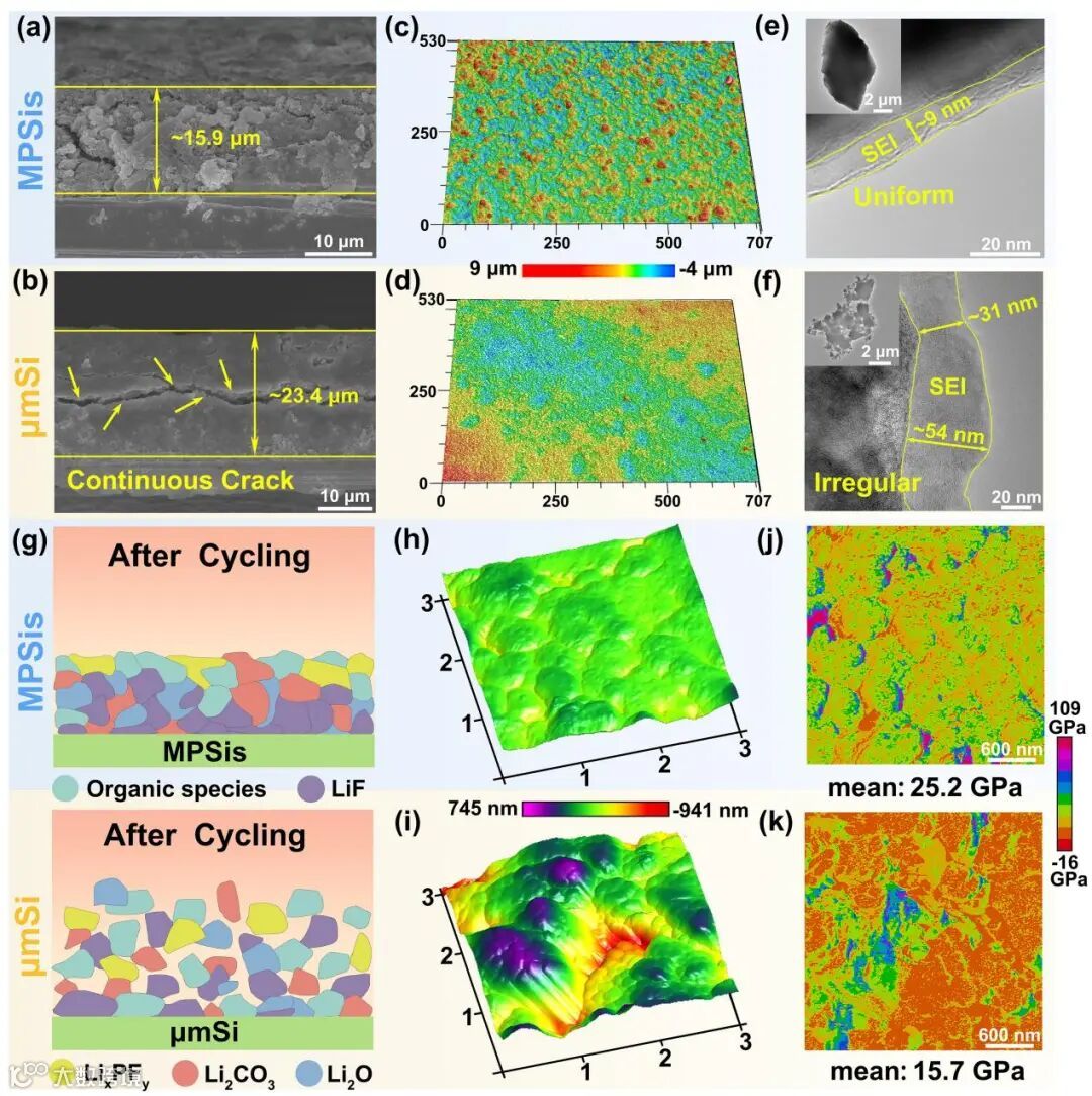 图6. 循环后的力学特性和界面形貌。(a) MPSis和(b) μmSi电极循环后的SEM横截面图。(c) MPSis和(d) μmSi电极循环后的三维表面轮廓仪得到的表面形貌,面积为530*707 μm。(e) MPSis和(f) μmSi负极循环后的透射电镜图像。(g)在MPSis和μmSi上的SEI膜示意图。循环后(h, j) MPSis和(i, k) μmSi电极的DMT模量映射和表面形貌通过AFM得到,面积分别为3*3 μm