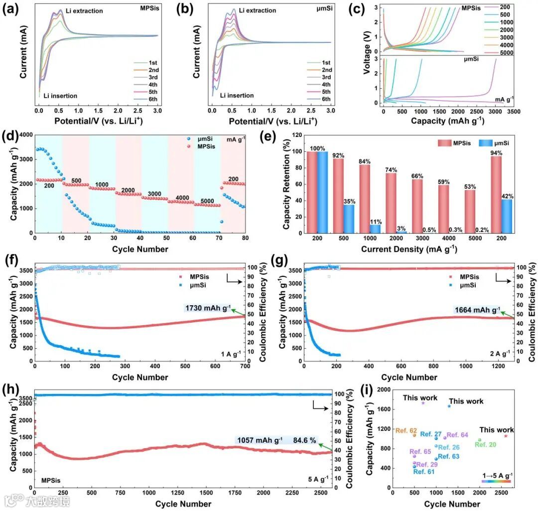 图4. MPSis和μmSi的电化学性能。(a) MPSis和(b) μmSi负极在0.2 mV s−1下从0.01 ~ 3.0 V的CV曲线。(c)恒流充放电曲线,(d)倍率性能和(e) MPSis和μmSi负极的容量保持。(f) 1A g−1、(g) 2A g−1和(h) 5A g−1时的长期循环稳定性。(i) MPSis负极与其他硅基负极的比较