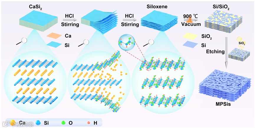 随着电动汽车和便携式电子设备的快速发展,对高能量密度锂离子电池的需求日益增长。硅负极因其超高理论比容量和丰富资源被视为极具前景的替代材料,但其在充放电过程中存在剧烈体积膨胀、结构粉碎及界面不稳定等问题,严重限制了其实际应用。近年来,结构设计、材料复合和界面调控等策略被广泛研究以缓解上述挑战。硅烯作为新兴的二维硅材料,可以提高离子传导速率缓冲体积膨胀,有望显著提升硅负极的电化学性能。然而,硅烯合成过程复杂、成本高,难以规模化应用。相比之下,硅氧烯作为一种结构类似硅烯的二维材料,可由商用硅钙低成本制备,在作为前驱体制备硅烯纳米片方面展示出很好的潜力。