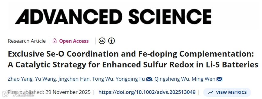 2025年12月5日,同济大学的温鸣教授与英国诺森比亚大学的傅永庆教授合作,在国际知名期刊Advanced Science上发表题为“Exclusive Se-O Coordination and Fe-doping Complementation: A Catalytic Strategy for Enhanced Sulfur Redox in Li-S Batteries”的观点文章。提出了一种通过在尖晶石Co3O4(Fe0.1Co2.9O4-Se)电催化剂中精准调控Se-O配位和Fe掺杂来增强锂硫电池中硫氧化还原的催化策略。该催化剂通过刻蚀-碳化法制备,形成交错多孔纳米结构,既利于电子/质量传输,又能暴露丰富的电活性位点。理论计算显示,Fe0.1Co2.9O4-Se可实现掺杂位点向氧原子的电子转移,富电子O原子调节催化行为;Fe掺杂缩小带隙增强导电性,Se-O配位提升d能带中心以强化LiPSs吸附与催化活性,二者协同不仅可以降低LiPSs的转化能垒,还能促进Li2S的瞬时沉积,实现Li2S的双向催化。基于上述的优势,Fe0.1Co2.9O4-Se阴极展现出优异的电化学性能。在0.5 C下500次循环容量衰减仅 0.1054%/圈;组装的软包电池进一步验证了实用价值性,在6.1 mg cm-2的高硫负荷和E/S = 10 μL mg-1的贫电解液条件下,经过40个圈的循环后,容量仍可保持在4.8 mAh cm-2,凸显其储能应用潜力。