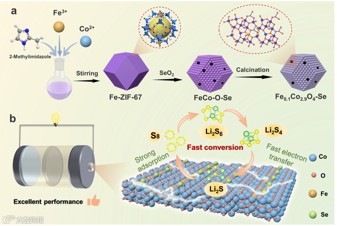 图1. Fe0.1Co2.9O4-Se的合成路线及其对LiPSs的作用机理示意图