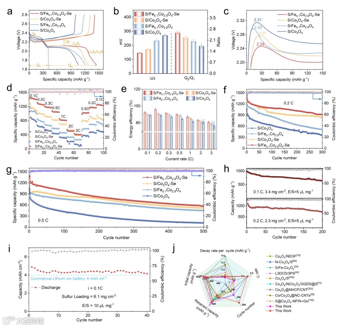所构建的S/Fe0.1Co2.9O4-Se电极在比容量(0.1 C时为1432 mAh g-1)、倍率性能(89%的可逆容量)和循环稳定性(在 0.5 C 下 500 次循环中每圈容量衰减率仅为 0.1054%)方面均表现出色。在实际贫电解质条件(E/S 比为10微升/毫克)和高硫负载(6.1 毫克/平方厘米)下,软包电池在 40 次循环后仍保持稳定的面积容量 4.8 毫安时/平方厘米,超过了锂离子电池的商业基准(4 毫安时/平方厘米)。
