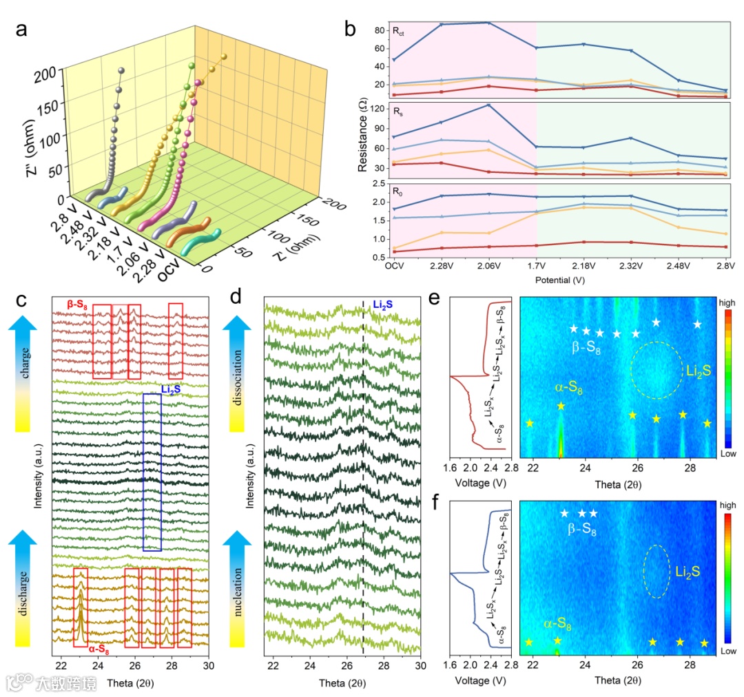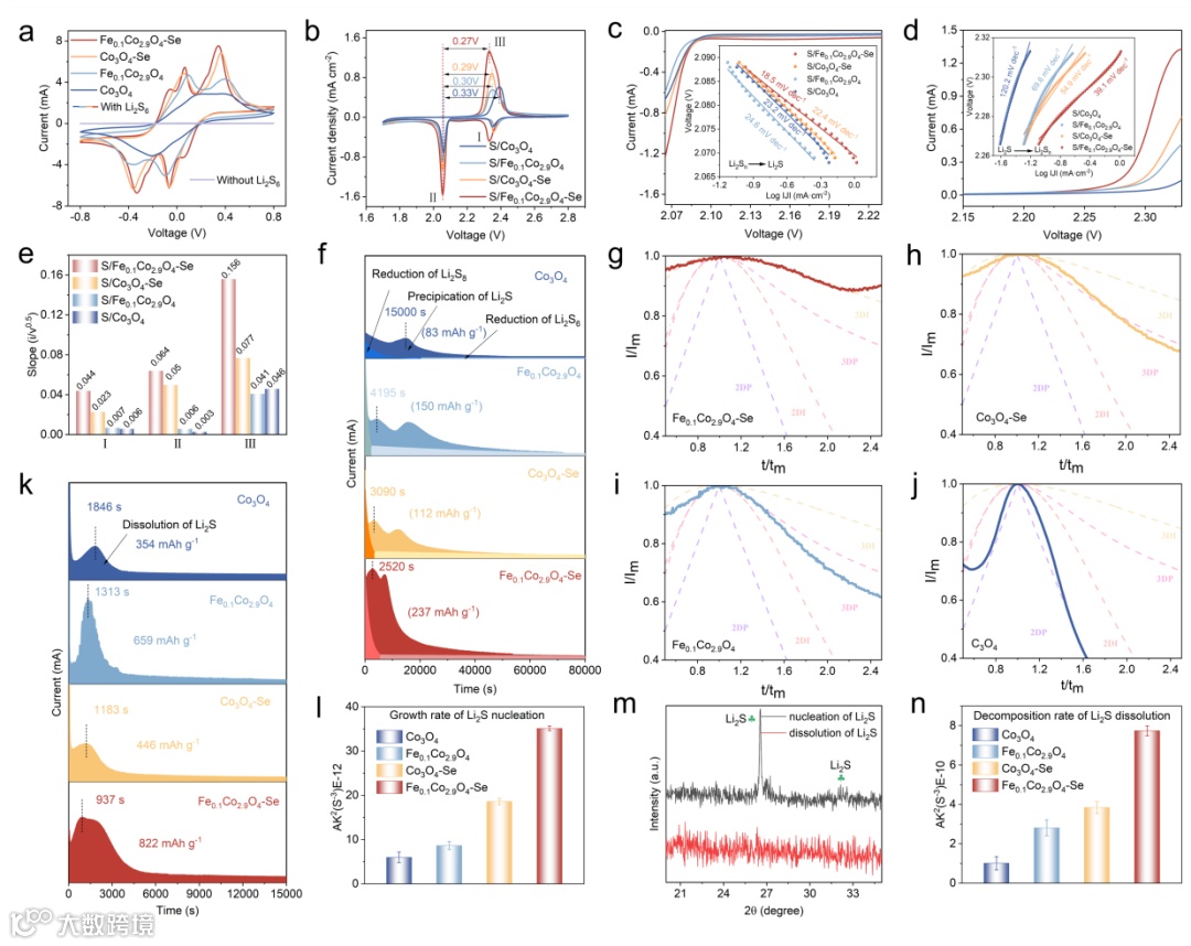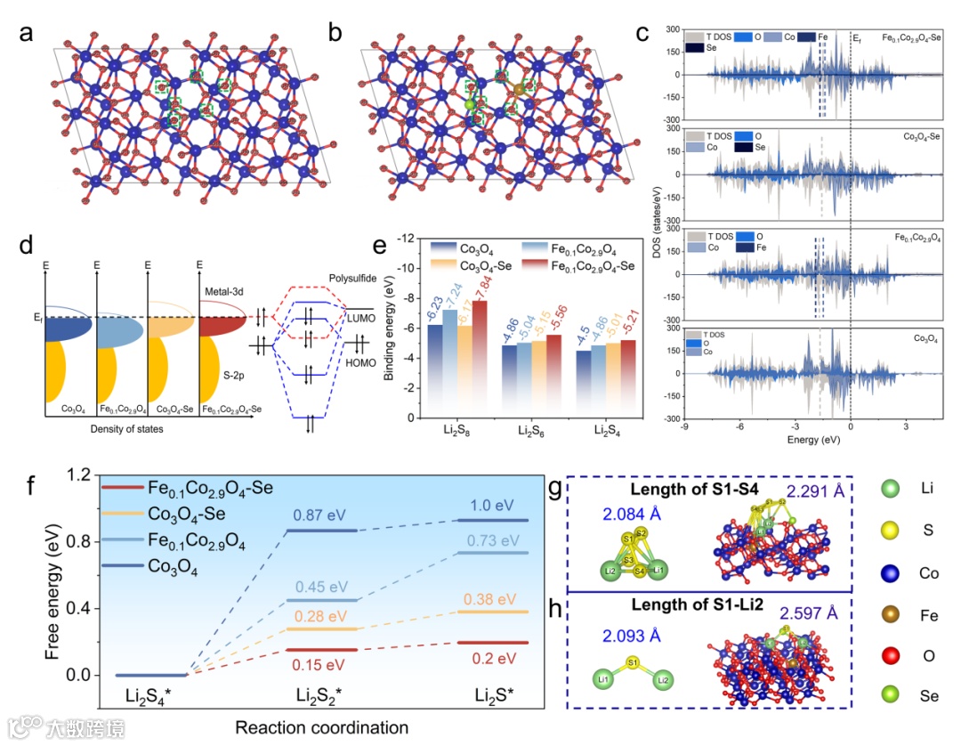 在Fe0.1Co2.9O4-Se电催化剂中,铁和硒共掺杂协同调节了电子结构,并优化了d轨道中心位置。具体而言,铁掺杂缩小了带隙,增强了Li2S沉积/溶解的容量,而独特的Se掺杂则上移了d带中心,降低了Li2S沉积/溶解的初始过电位。这种电子结构的重新配置增强了电导率,并加强了对LiPS的吸附能和催化活性。这两个因素的互补性共同促进了Fe0.1Co2.9O4-Se中Li2S的三维瞬时成核,并降低了LiPS双向转化的能垒。