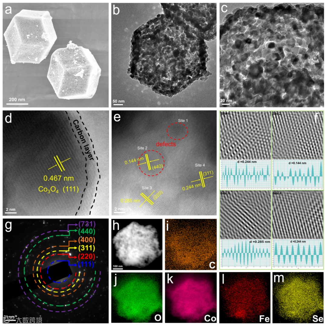 图2. Fe0.1Co2.9O4-Se的SEM和TEM表征