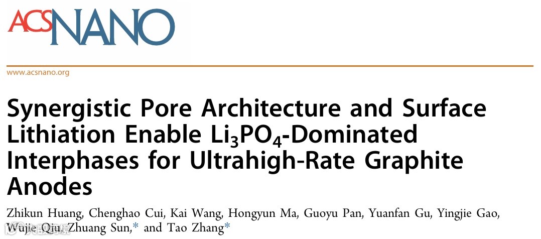 近日,来自中国科学院上海硅酸盐研究所的张涛研究员与孙壮副研究员,在国际知名期刊ACS Nano上发表题为“Synergistic Pore Architecture and Surface Lithiation Enable Li3PO4-Dominated Interphases for Ultrahigh-Rate Graphite Anodes”的研究文章。该文章提出一种金属辅助刻蚀的亚微米钻孔工艺,将孔结构设计与表面化学工程相结合,制备得到表面锂化的多孔石墨(LPG)负极材料。不同于传统多孔石墨(PG),LPG不仅实现了锂离子扩散距离的缩短,同时保持低比表面积(≤ 2 m2∙g-1)和超过90 %的ICE;而且其锂化表面可促进富含磷酸锂的SEI膜形成,显著降低锂离子的脱溶剂化势垒,相应电池在5 C条件下2000次循环后仍保持约90%的容量,50 C的脱锂容量能达到327 mAh∙g-1。现在该材料已能做到公斤级生产,并经过了软包电池验证,适合工业化应用,该工作为开发高倍率石墨负极材料提供了参考。