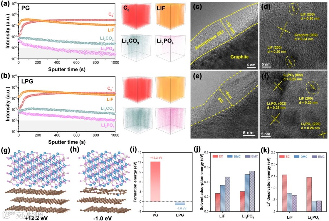 图5 (a)PG和(b)LPG的ToF-SIMS 深度剖面及对应的三维可视化图; PG 负极的(c)侧视 与(e)俯视TEM 图像;LPG 负极的(d)侧视 与(f)俯视TEM 图像(e) LPG 负极的侧视 TEM 图像;(gi)PG与LPG表面上Li3PO4(002) 晶面的形成能比较;(j、k) LiF (200) 与Li3PO4(002)表面上溶剂吸附能以及 锂离子脱溶剂能垒的比较。