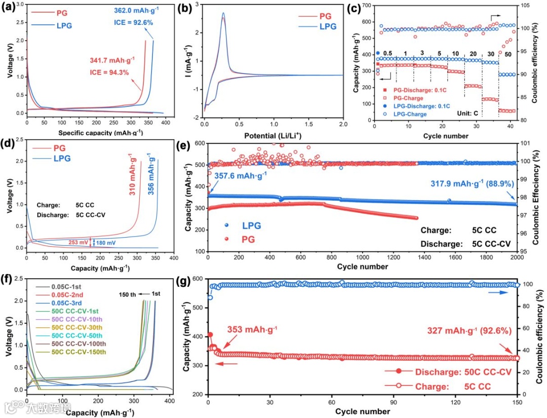 图4(a)PG与LPG在0.05 C条件下的首次充放电曲线;(b)PG与LPG的CV曲线;(c)PG与LPG的倍率性能;(d)首次CC-CV充放电曲线;(e)PG与LPG在5 C条件下的长期循环性能;(f)LPG 负极的脱锂性能与(g)LPG负极在50 C条件下的长期循环性能(CC-CV)。