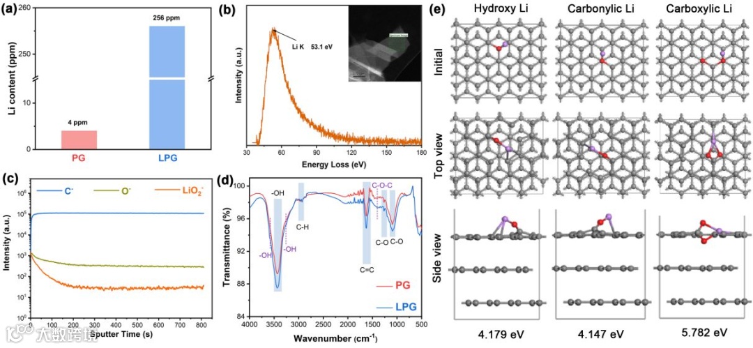图3 (a)PG与LPG的锂含量,(b)EELS光谱,(c)TOF-SIMS光谱,(d)PG与LPG的FTIR光谱和(e)LPG的可能构型。