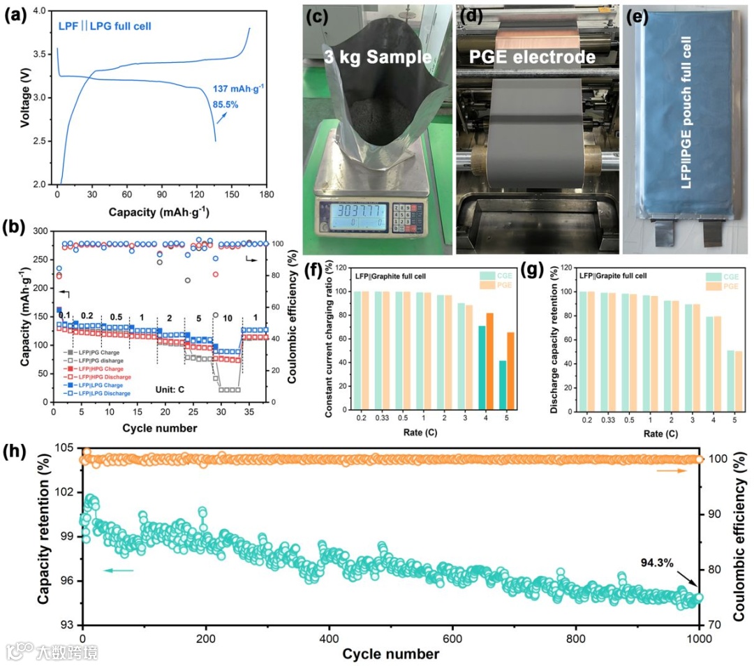 以 LPG为负极、磷酸铁锂(LFP)为正极的全电池在正极质量基准下实现了137.0 mAh·g-1的容量,并且ICE达到 85.5%,这与传统的 LFP‖石墨电池的表现相当,并展现出最优的倍率性能。通过工艺的放大,成功实现千克级别的多孔石墨生产。组装软包电池后经测试发现,多孔石墨结构可有效提升锂离子电池的高倍率性能,尤其是在5 C高倍率条件下,多孔石墨组装的电池充电容量保持率分别较商业石墨组装的电池高出24.0%,说明多孔石墨极显著改善了电极在高电流下的锂离子嵌入能力。进一步地,该软包电池在经历1000次充放电循环后,仍能保持94.3%的初始容量,显示出卓越的循环稳定性与结构耐久性。