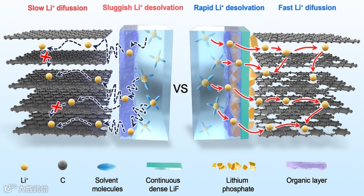图1. 锂离子在PG负极与LPG负极表面脱溶剂化和扩散示意图。