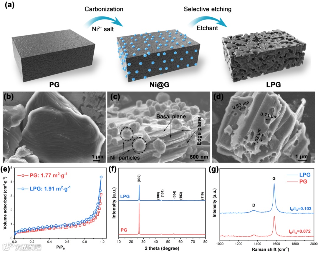 图2 (a) LPG制备过程示意图,(b) PG、(c) Ni@G和(d) LPG的SEM图像,(e) PG和LPG的N2吸附-脱附等温线,(f) XRD图谱,以及(g) 拉曼光谱。